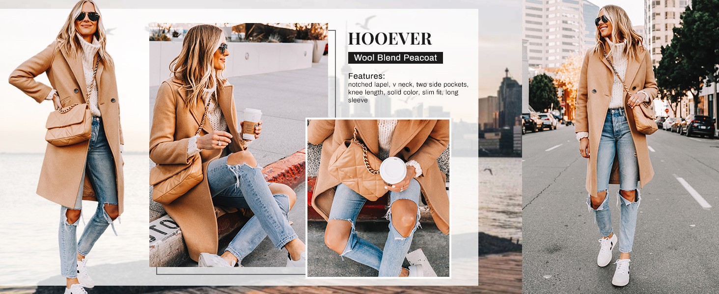 Abrigo de lana de invierno para mujer Hooever, informal, con solapa con muesca, de botonadura sencil