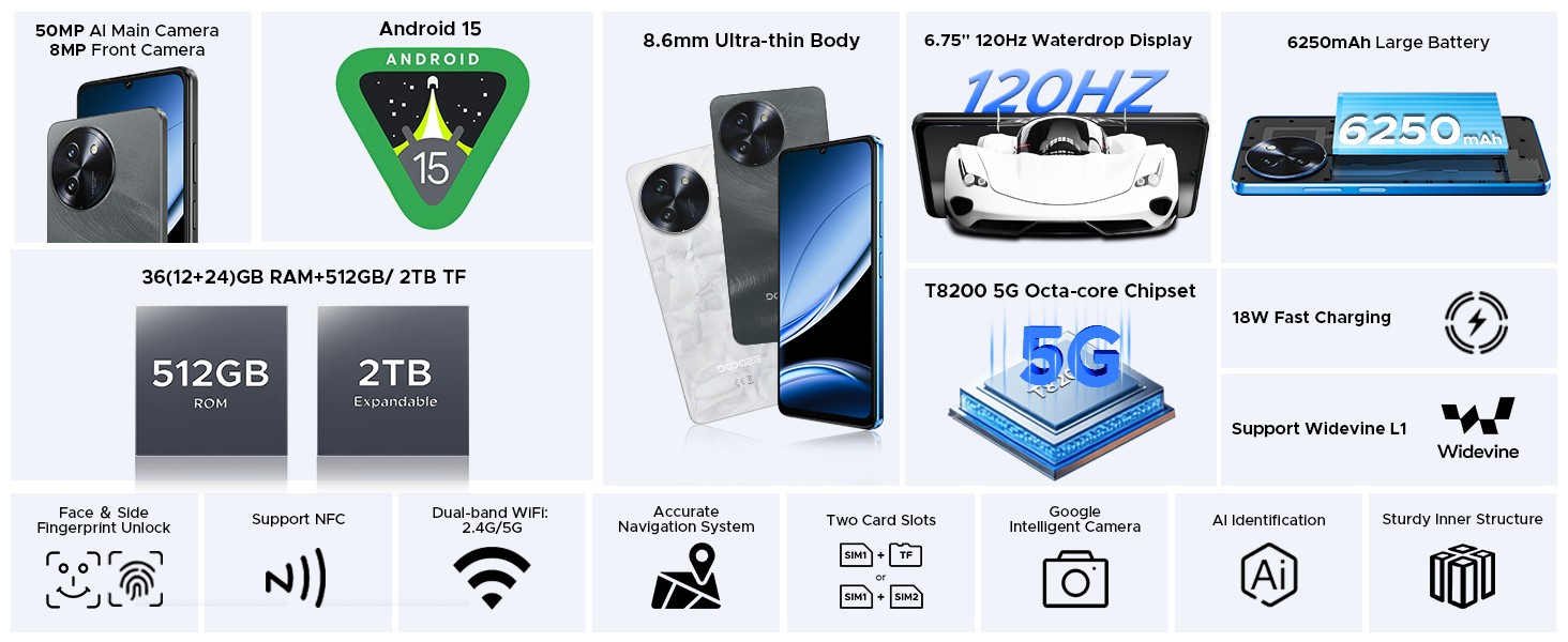 DOOGEE Note 59 Pro+ 5G Android 15 desbloqueado, 36 GB + 512 GB/2 TB expandible, pantalla HD+ de 6,75